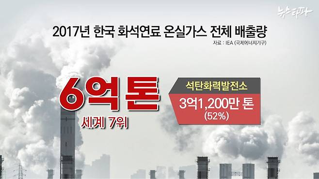 국제에너지기구(IEA)에 따르면 지난 2017년 한국의 화석연료 온실가스 전체 배출량은 6억 톤으로 세계 7위다. 이 중 석탄화력발전소가 뿜어내는 온실가스는 3억1200만 톤으로 52%를 차지한다.