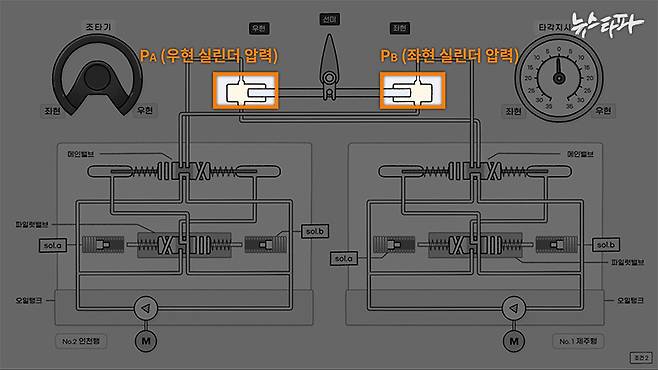 그렇다면 그래프상 우현 실린더 압력(Pa)이 좌현 실린더 압력(Pb)보다 12bar 정도 크기 때문에, 좌현 실린더에 30bar 가량이 더해지면 타는 당연히 왼쪽으로 되돌아갈 수 있습니다. 여기까지는 사참위의 설명에 고개가 끄덕여집니다.