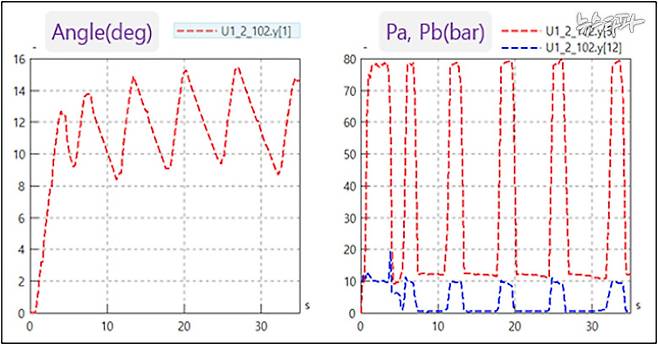 모형 제작과 실험 용역을 수행한 ‘제이앤에프솔루션’ 측에 확인한 결과, Pa(빨간색)와 Pb(파란색)는 각각 우현 실린더와 좌현 실린더의 내부 압력이었습니다. 그러니까 Pa가 Pb보다 크면 타는 우현으로 돌고, 반대라면 좌현으로 돌게 된다는 뜻입니다.