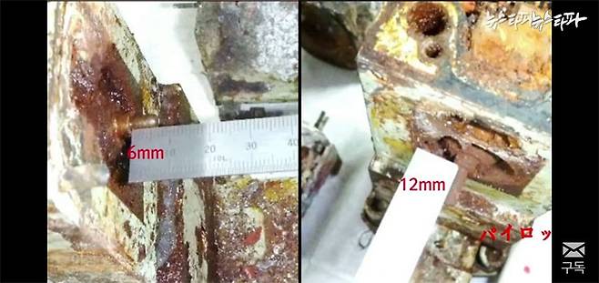인양을 하면서 선체를 들어올리고 내리는 과정에서의 충격으로 철심이 한쪽으로 밀렸을 가능성도 희박합니다. 만약 그랬다면 좌우 타기장치에 각각 2개씩 모두 4개의 철심에 동일한 충격이 전달돼 모두 한 방향으로 밀렸어야 하지만 실제로는 단 1개만 밀려 있는 상태였기 때문입니다.