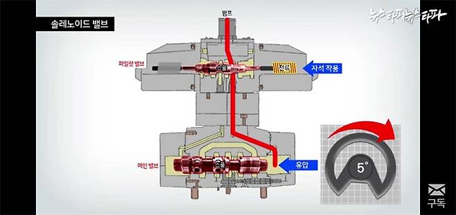 이 문제 역시 새누리호 시험 결과로부터 유추가 가능합니다. 당시 선조위 조사팀은 새누리호의 좌우 타기펌프를 모두 가동시키면서 한번은 우현 5도 조타명령 중 오른쪽 솔레노이드 밸브를 고착시키고, 또 한번은 좌현 5도 조타명령 중 왼쪽 솔레노이드 밸브 고착을 시험했습니다. 오른쪽 고착 상황에선 앞서 설명한대로 타가 우현 35도까지 돌아간 반면, 왼쪽 고착 상황에서는 타가 좌현 8도까지만 돌아간 뒤 멈췄습니다. 왜 이런 차이가 나타났을까요?