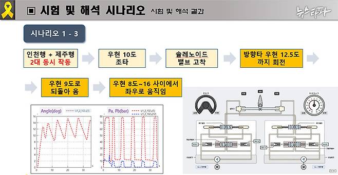 사참위는 중간발표 현장에서 모두 14개 시나리오에 대한 시험 결과를 언론에 배포했습니다. 그 가운데 선조위 내인설 검증 시험(시나리오 1-3)에 대한 내용을 보면, 앞서 언급한 것처럼 좌우 타기펌프를 모두 작동시키다가 우현 10도 타각 명령을 주고 한쪽 솔레노이드 밸브를 고착시켰더니, 타가 우현 12.5도까지 돌아갔다가 우현 9도로 되돌아온 뒤 우현 8도와 16 사이에서 좌우 움직임을 반복하는 결과가 나왔다고 기재됐습니다.