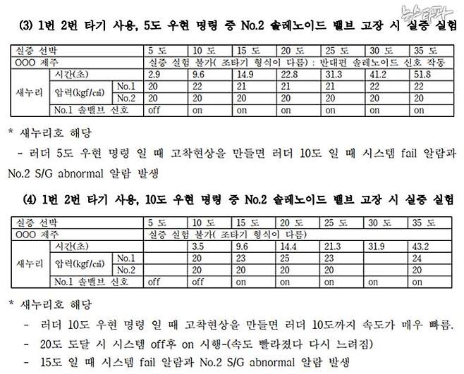 새누리호는 2004년에 건조돼 선조위 실험 당시인 2018년에는 이미 14년이나 운항한 상태였습니다. 새누리호의 경우 왼쪽 타기장치의 성능이 상대적으로 더 많이 떨어진 상태였기 때문에 왼쪽 솔레노이드 밸브가 고착돼 좌현 실린더에 계속 유압이 작용해도 반대편 타기의 자동제어 유압이 상대적으로 높아 타가 더 이상 돌아가지 않았던 것입니다.