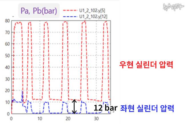 그렇다면 그래프상 우현 실린더 압력(Pa)이 좌현 실린더 압력(Pb)보다 12bar 정도 크기 때문에, 좌현 실린더에 30bar 가량이 더해지면 타는 당연히 왼쪽으로 되돌아갈 수 있습니다. 여기까지는 사참위의 설명에 고개가 끄덕여집니다.