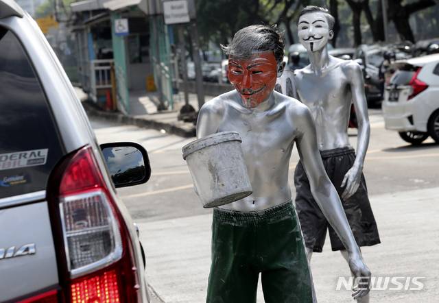 [자카르타=AP/뉴시스]14일(현지시간) 인도네시아 자카르타의 번잡한 교차로에서 거리 공연자들이 공연을 펼치며 운전자들에게 소정의 관람료를 요청하고 있다. 2020.08.14.