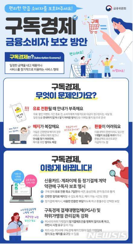 금융위원회는 3일 "구독경제의 유료전환, 해지, 환불 등 과정에서 카드·계좌이체 결제시 소비자의 '알권리'를 보호하고 '이용한 만큼'만 부담하며, '해지는 간편하게'하는 방안을 마련했다"고 밝혔다. 이는 최근 신종 코로나바이러스 감염증(코로나19) 등으로 인해 비대면·정기배송 서비스가 확산되고 있지만, 소비자에게 유료전환 일정을 명확히 알리지 않거나 해지·환불을 어렵게 하는 등 소비자의 피해가 증가하는 데 따른 조치다.
