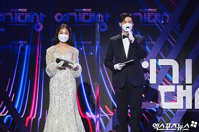 [엑스포츠뉴스 박지영 기자] 30일 오후 서울 상암동 MBC 신사옥에서 진행된 '2020 MBC 연기대상'에 참석한 배우 김혜윤, 가수 차은우가 시상하고 있다.