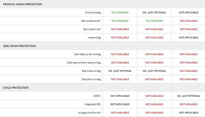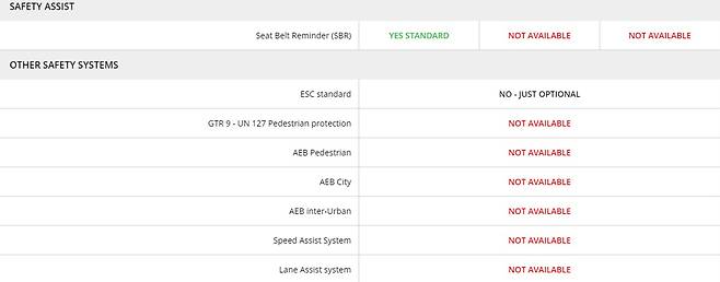 자료를 보니 정면충돌 테스트에서 앞좌석 더미 흉부에 큰 부상이 있었다. 후면충돌 테스트에선 목 부분 보호에 문제가 있었다. 참고로 모닝은 2017년 유로NCAP 충돌 테스트에서는 별 3개를 받은 바 있다. 성인 탑승자 보호 79%, 어린이 탑승자 보호 64%, 보행자 안전 54%, 안전 보조 시스템 25%였다. 이유를 살펴본 결과 기본 안전 사양에 큰 차이가 있었다.