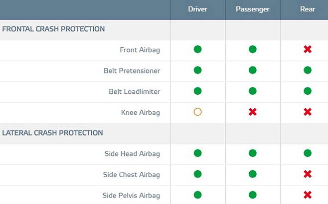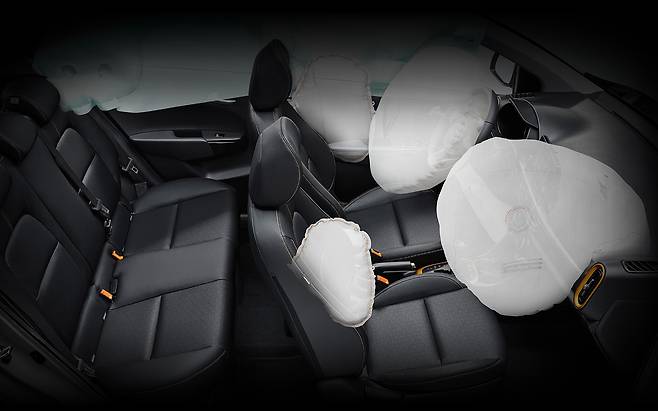 그렇다면 국내 사양은 어떨까. 가장 아래 트림부터 운전석과 동승석, 커튼, 사이드 에어백까지 총 6개 에어백을 넣었다. 여기에 후방 주차 거리 경고와 경사로 밀림 방지 장치, 급제동 경보 시스템, 타이어 공기압 경보 시스템도 들어간다. 시그니처 트림은 운전석 무릎 에어백과 함께 전방 충돌방지 보조, 후측방 충돌 경고, 후방 교차 충돌 경고 등 첨단 운전자 보조 시스템도 기본이다.