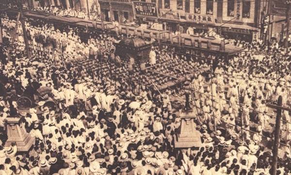 | ▲ 순종의 장례인 인산 행렬. 상여를 둘러싸고 군중들이 행진하고 있다. |