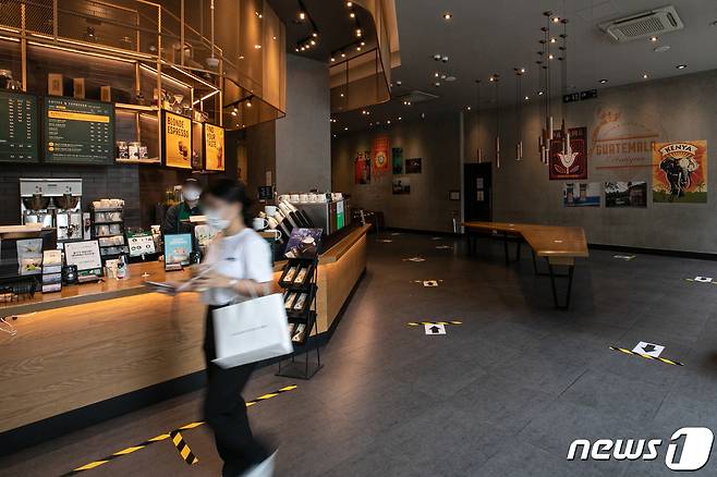 (서울=뉴스1) 이승배 기자 = 수도권 지역의 신종 코로나바이러스 감염증(코로나19) 확산을 막기 위해 사회적 거리두기 2.5단계 조치가 시행되고 있는 31일 서울 시내의 한 프랜차이즈형 커피전문점에서 한 시민이 음료를 가져가고 있다.