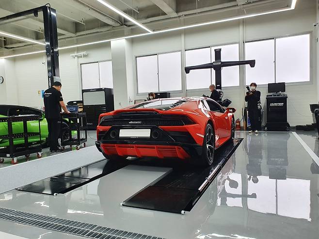 람보르기니 인증 중고차 사업을 위해 새롭게 개설된 대규모 서비스센터는 총 10개의 워크 스테이션과 함께 람보르기니 전용 진단기 및 공인 얼라인먼트 계측장비 등 최신 장비들을 완벽하게 갖추고 있다.