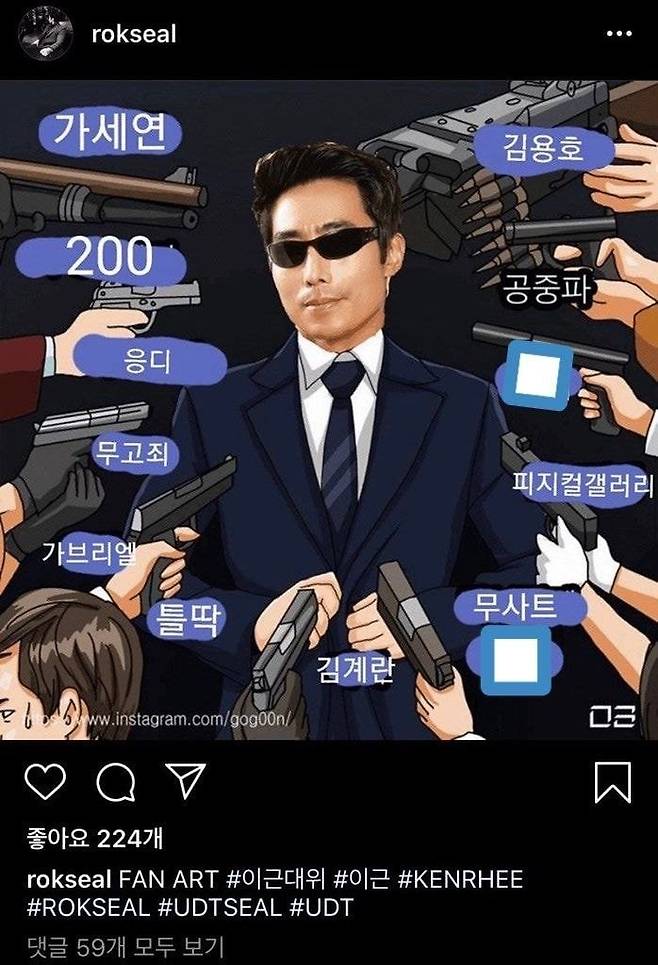 그 중 한 장의 사진이 누리꾼들의 관심을 받았다.'김용호', '한녀', '피지컬갤러리', '무사트', '페미', '김계란', '틀딱', '무고죄', 가세연' 등의 키워드가 이근을 향해 총을 들고 있는 모습. 팬이 만들어준 팬아트였다.