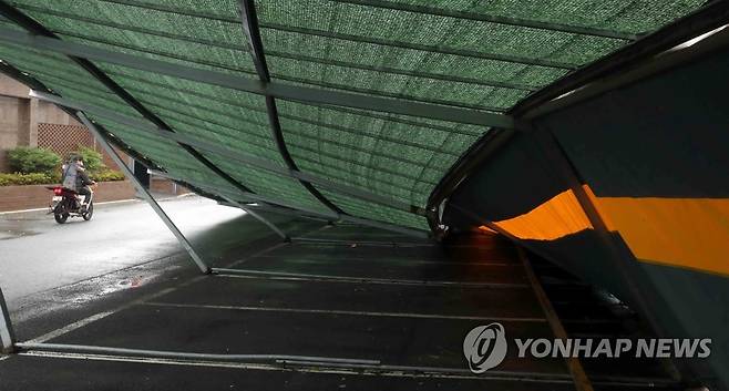 (창원=연합뉴스) 김동민 기자 = 태풍 '하이선' 영향으로 7일 오전 경남 창원시 마산합포구 한 숙박업소 야외 주차장 천막이 붕괴됐다. 2020.9.7