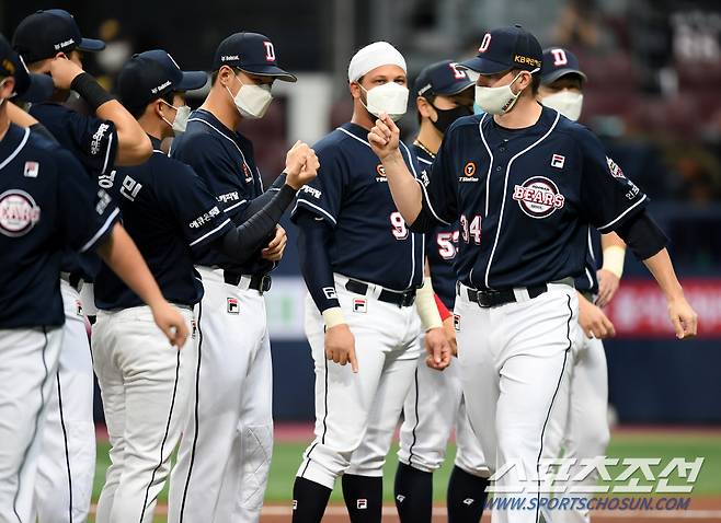 2020 KBO리그 한국시리즈 1차전 두산 베어스와 NC 다이노스의 경기가 17일 고척스카이돔에서 열렸다. 두산 선수들이 선수소개때 그라운드로 도열하고 있다. 고척=허상욱 기자 wook@sportschosun.com/2020.11.17/