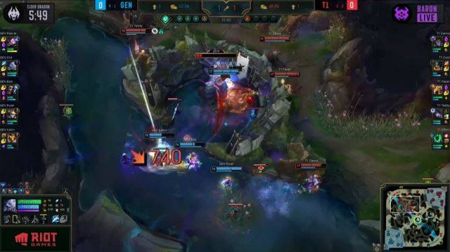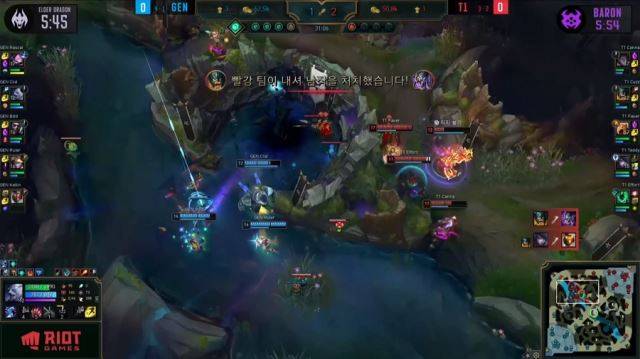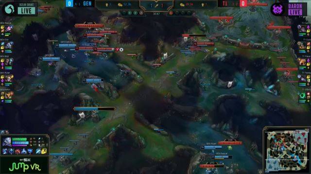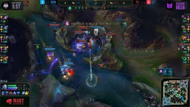T1은 빠른 속도로 내셔 남작의 체력을 깎았다. 김광희와 박재혁을 제외한 젠지 3인은 T1의 내셔 남작 사냥을 저지하기 위해 전투태세에 돌입했다. 바다 드래곤을 사냥하던 박재혁도 53초경 순간이동해 4초 뒤인 57초경 내셔 남작 둥지 인근에 도착했다.