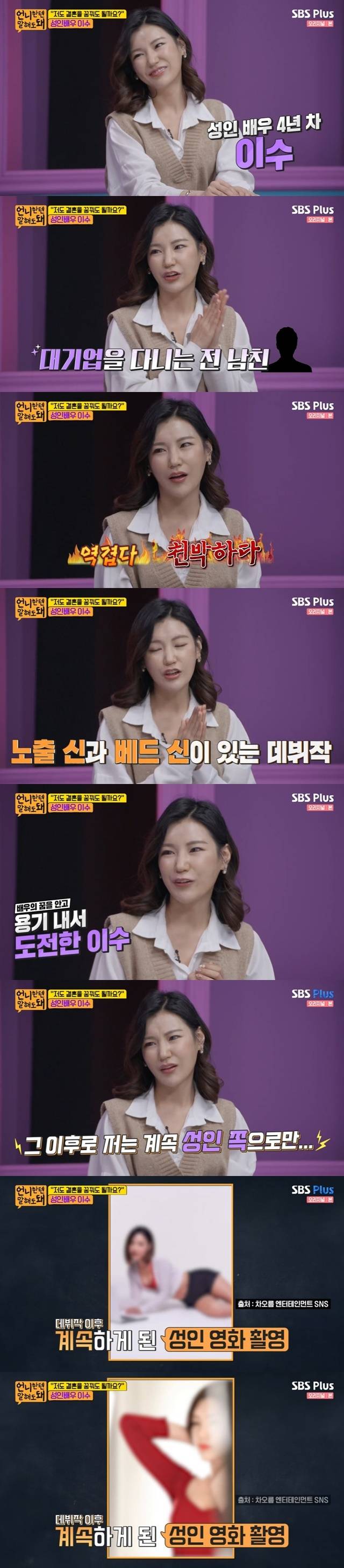 스튜디오에도 직접 출연한 이수는 전남친에게서 “역겹다, 천박하다, 너한테 많은 걸 걸었는데 네가 내 인생을 다 망쳐버렸다”는 말을 들었다며 “원래 성인배우 하려고 된 건 아니고 저예산 상업영화로 데뷔했다. 노출신과 베드신이 있는데 할 수 있냐고 해서 큰마음 먹고 했다. 그 이후로 저는 계속 성인 쪽으로만 일을 할 수밖에 없었다”고 털어놨다.
