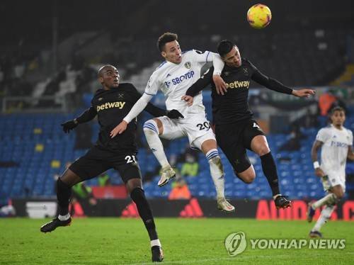 epa08878287 Rodrigo of Leeds (C) wins the header during the English Premier League soccer match between Leeds United and West Ham United in Leeds, Britain, 11 December 2020. EPA/Gareth Copley / POOL EDITORIAL USE ONLY. No use with unauthorized audio, video, data, fixture lists, club/league logos or 'live' services. Online in-match use limited to 120 images, no video emulation. No use in betting, games or single club/league/player publications.