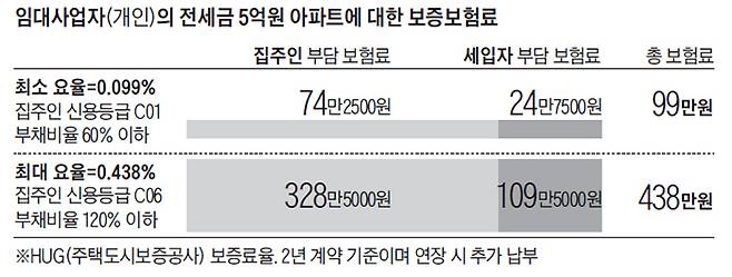 임대보증금 보증보험은 주택도시보증공사(HUG)나 서울보증보험(SGI)을 통해 가입할 수 있다. 보험료는 HUG의 아파트 보증금 보험 기준으로 '전·월세 보증금의 0.099~0.438%'로 책정됐다. 지난달 서울 아파트 평균 전세금인 5억원을 기준으로 계산하면 2년간 총보험료는 99만~438만원이다. 계약 기간이 길어지면 보험료도 더 내야 한다. 임대사업자 신용 등급이 낮을수록, 임대주택 부채(담보대출 등) 비율이 높을수록 보험료가 올라간다. 단독주택 보험료는 아파트의 1.3배다.