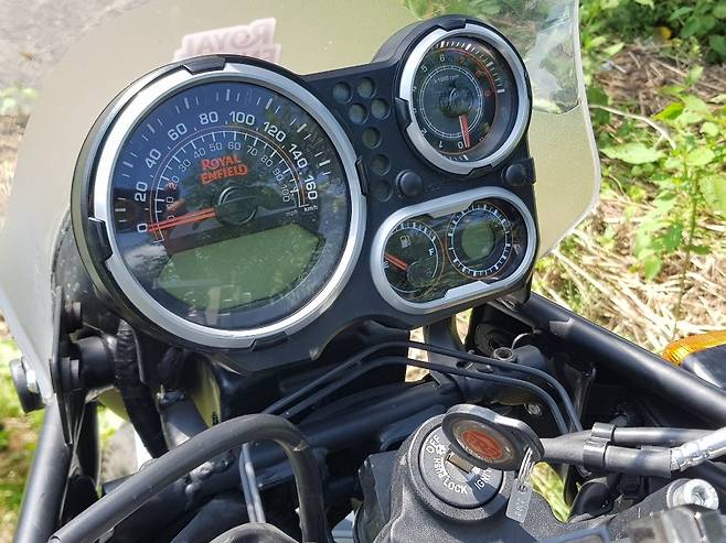 계기반에서는 속력과 RPM, 기어 표시, ABS 작동여부, 시간, 그리고 나침반과 같은 다양한 정보를 제공한다. 특히 우측 하단에 보이는 나침반은 히말라얀이 ‘길떠나는 사람’들을 위한 발이 되기 위한 바이크라는 걸 새삼 느끼게 해준다.