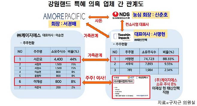 아모레퍼시픽의 방계기업인 태신인팩, 농심그룹의 계열사 농심데이타시스템(농심NDS) 등이 참여한 컨소시엄 소속 업체들이 2013년부터 전체 물량의 절반 이상을 독차지한 것으로 나타났다. 특히 이들 업체가 마감 시간을 지나 입찰제안서를 내고, 제안서에 허위 내용을 기재하는 등 입찰 규정을 어겼는데도 강원랜드 측이 특혜를 주면서 일감을 넘겨준 사실도 확인됐다. 태신인팩의 서명현 대표는 서경배 아모레퍼시픽 회장의 5촌 친인척으로 잘 알려져 있다. 농심그룹의 신춘호 회장은 서 회장의 장인이다.
