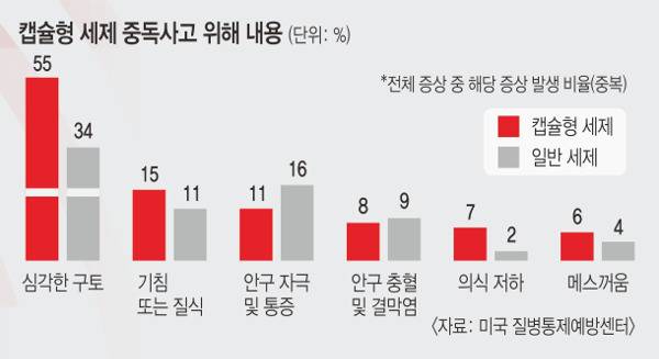 캡슐형 세제를 삼키면 구역질, 구토, 기침, 질식 및 호흡곤란, 의식상실, 식도 및 위의 궤양 등이 나타날 수 있으며 심하면 식도와 위장에 구멍이 뚫리는 합병증이 초래될 수 있다. 김 교수는 “특히 구토하는 과정에서 계면활성제 성분이 기도로 들어가면 기관지 및 폐포에 심각한 손상을 줘 ‘흡인성 폐렴’으로 이어질 수 있다”고 지적했다. 캡슐 속 세제가 눈에 튈 경우 각막과 결막에 직접 자극을 주고 심하면 화학적 화상과 그에 따른 각막혼탁 등에 의해 일시적 실명으로 이어질 수 있다.