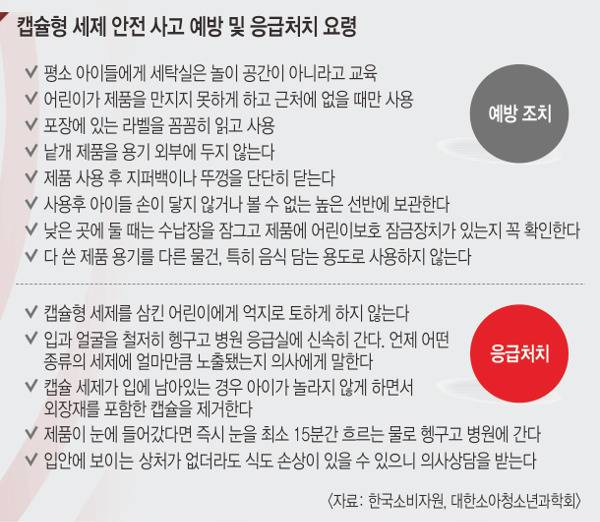 국내의 경우 캡슐형 세제의 어린이보호포장(지퍼백형 등), 포장재 강도, 주의사항 표시 등 안전성 강화 조치가 뒤늦게 취해졌지만 관계당국의 보다 철저한 관리감독 및 정기적인 실태 조사가 필요하다는 지적이 나온다. 특히 어린이 삼킴사고 시 올바른 응급처치 요령에 대한 표준화된 문구를 마련해 표기할 필요가 있다. 김 교수는 “캡슐형 세제를 아이가 삼켰을 땐 억지로 토하게 해선 안된다. 기도 흡인이나 폐 손상 등 심각한 손상을 일으킬 수 있어 최대한 빠르게 응급실 진료를 받아야 한다”고 강조했다.