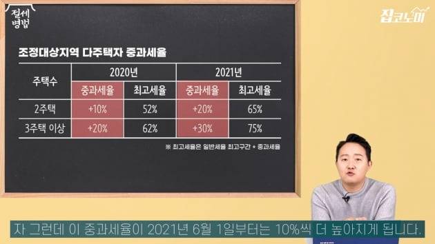 자 그런데 이 중과세율이 2021년 6월 1일부터는 10%씩 더 높아지게 됩니다. 지금 현행은 조정대상지역 내의 집을 팔 때 만약에 내가 2주택자라고 하면 10%를 중과세하고요, 3주택자는 20%를 중과세하고 있어요. 그런데 2021년 6월 1일 이후부터는 10%씩 더해서 2주택자는 20% 중과세, 3주택자 이상은 30%를 중과세하도록 돼 있습니다.