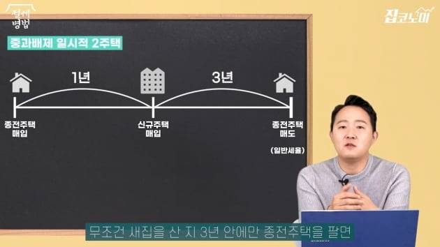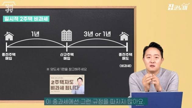 비과세의 일시적 2주택 규정과는 다르죠. 비과세에서 일시적 2주택 규정은 기존 주택을 산 지 1년 이상 경과한 뒤 새집을 사고, 새집을 산 지 3년 안에 종전주택을 팔면 비과세를 해줬죠. 아니면 조정대상지역에선 1년 안에 종전주택을 팔아야 비과세를 해줬는데요.