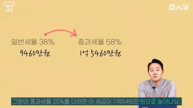 양도차익이 3억원이 난 집을 판다고 한 번 생각을 해볼 때 일반세율이 적용되면 3억원은 양도세율이 38%입니다. 그런데 여기서 이 집이 3주택 이상자라고 했을 때는 20%가 중과세됩니다. 그 말은 38%였던 세율이 58%로 적용된다는 거예요.