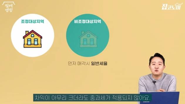 하지만 비조정대상지역 주택을 먼저 팔게 되면 차익이 아무리 크더라도 중과세가 적용되지 않아요. 그 다음에 조정대상지역에 있는 주택을 팔 땐 1주택자니까 중과세도 피할 수 있고, 요건을 갖췄다면 1가구 1주택 비과세 규정을 적용받을 수도 있겠죠.