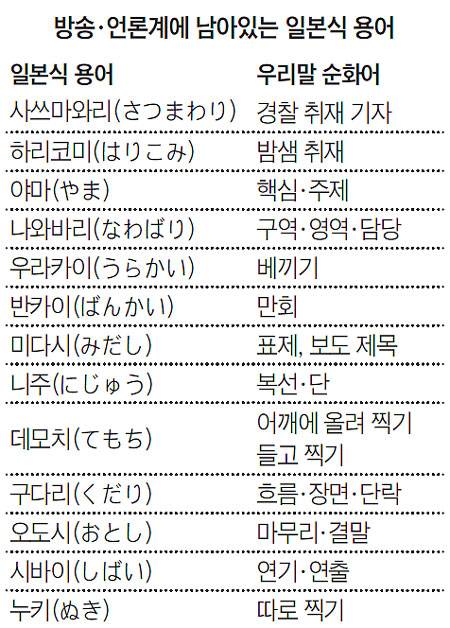 언론계 일본어의 역사도 뿌리 깊다. 이재경 이화여대 커뮤니케이션·미디어학부 교수는 "1920~30년대 일본에서 교육받은 인력이 한국에 들어와 신문을 만들기 시작하면서 단기간에 '기자 문화'가 만들어졌다. 용어뿐 아니라 언론 생태계 전체가 그 당시 일본 흔적을 완전히 떨쳐내지 못하고 있다"면서 "젊은 기자들이 문제의식을 갖고 고치려 노력해야 한다"고 했다.