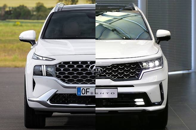 현대차 싼타페 부분변경 출시로 기아차 쏘렌토와의 본격 경쟁이 시작됐다. 두 차량은 플랫폼과 파워트레인 등 많은 부분을 공유한다. 그러나 쏘렌토의 에어백이 싼타페보다 2개더 많으며, 2열 이중접합 차음 유리는 싼타페에만 적용된다. 두 차량을 비교했다.