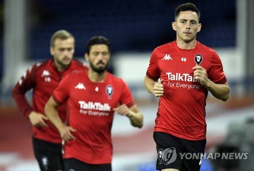 epa08674123 Ian Henderson of Salford and teammates during the warm-up before the English Carabao Cup second round match between Everton and Salford City in Liverpool, Britain, 16 September 2020. EPA/Peter Powell / Pool EDITORIAL USE ONLY. No use with unauthorized audio, video, data, fixture lists, club/league logos or 'live' services. Online in-match use limited to 120 images, no video emulation. No use in betting, games or single club/league/player publications.