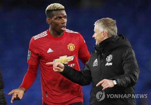 epa08901919 Manchester United manager Ole Gunnar Solskjaer (R) speaks to Paul Pogba after the Carabao Cup quarter final mach between Everton and Manchester United in Liverpool, Britain, 23 December 2020. EPA/Clive Brunskill / POOL EDITORIAL USE ONLY. No use with unauthorized audio, video, data, fixture lists, club/league logos or 'live' services. Online in-match use limited to 120 images, no video emulation. No use in betting, games or single club/league/player publications.
