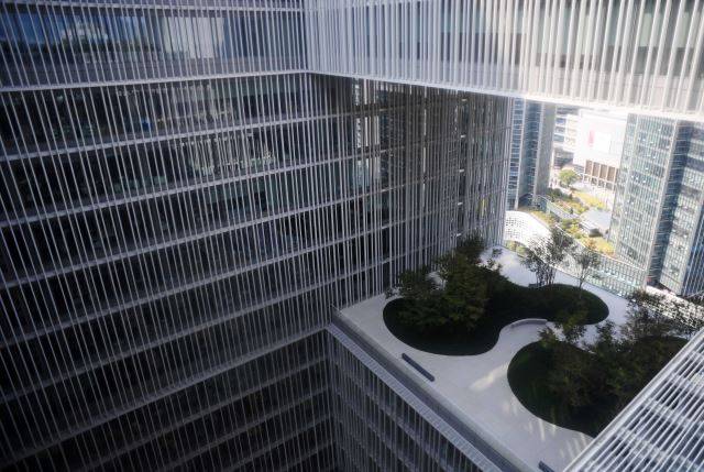 이 사옥엔 이런 공중정원이 무려 세 개나 된다. 5층에 이어 11층, 17층에 있는데, 각기 서로 다른 방향으로 6개 층의 공간만큼 옆구리를 뻥 뚫어(오프닝) 사방의 풍경을 건물 안으로 끌어들였다. 5층은 동남쪽으로 용산 미군기지가, 11층은 남서쪽으로 용산 도심 풍경이, 17층은 북동쪽으로 남산타워가 한눈에 들어오는 위치에 오프닝을 만들었다. 동양 건축에서 말하는 ‘차경’(자연의 경치를 빌리는 것) 효과를 한껏 살린 것이다. 자신을 비움으로써 세상의 풍경을 다 끌어안았다. 서구의 건축가가 구현한 동양적 미학에 반하지 않을 수 없었다.