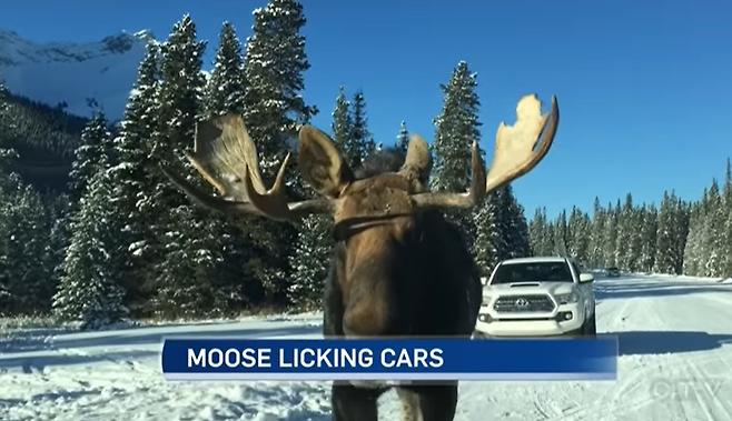 캐나다에서 무스는 눈을 녹이기 위해 차에 사용하는 소금 맛을 좋아해서 자동차의 패널을 핥기 위해 접근한다고 한다. 재스퍼 국립공원의 스티브 영(Steve Young)은 “이 일은 몇 년 전부터 종종 이슈로 떠올랐으며 지금은 너무 흔하다”라고 말했다.