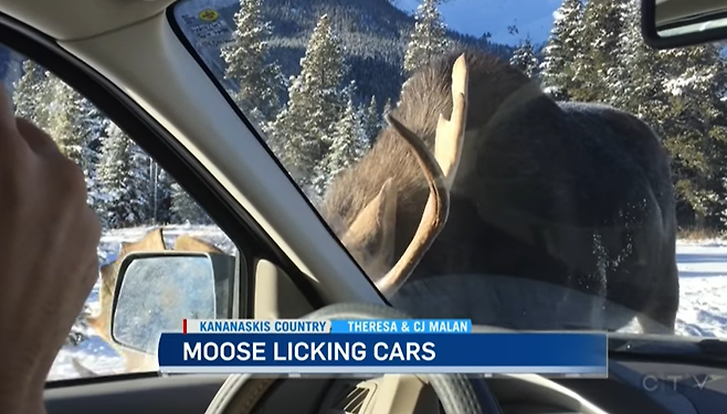 하지만 이 팻말은 실제로 캐나다에서 경고하고 있는 것으로 일부 지역에선 골치 아픈 문제 중 하나라고 한다. 겨울철 재스퍼의 말리뉴 레이크 로드에서 무스가 차를 핥고 있는 광경은 최근 흔하게 벌어지고 있으며, 이런 모습을 담은 영상이 공개되기도 했다.