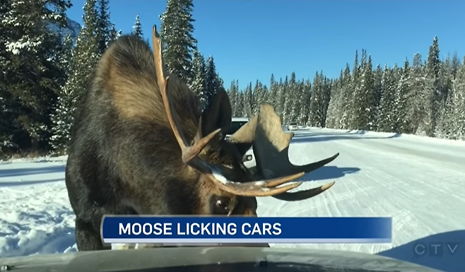 캐나다에서 무스는 눈을 녹이기 위해 차에 사용하는 소금 맛을 좋아해서 자동차의 패널을 핥기 위해 접근한다고 한다. 재스퍼 국립공원의 스티브 영(Steve Young)은 “이 일은 몇 년 전부터 종종 이슈로 떠올랐으며 지금은 너무 흔하다”라고 말했다.