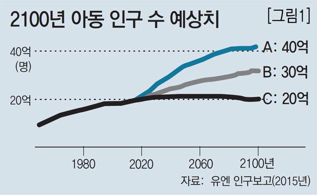 그러나 유엔의 전문가들은 2100년의 아동의 수도 오늘날과 같은 20억 명으로 예상하였습니다. 즉 선이 같은 방향으로 계속 증가하면서 이어지지 않을 거라 예상했습니다. 여기에는 출산율 감소, 열악한 지역의 아동 사망률과 같은 여러 가지 이유가 숨어 있습니다.