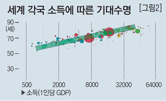 물론 직선 형태를 띠는 현상도 없는 것은 아닙니다. [그림 2]는 세계 각국의 소득에 따른 기대 수명을 나타내는 도표입니다. 여기에 있는 동그라미들은 각 나라를 표시한 것입니다. 동그라미가 많이 모인 곳을 따라 선을 그으면 우상향 직선이 나옵니다. 어떤 동그라미는 선에 걸쳐 있고 어떤 동그라미는 선 밖에 있기도 하지만 대체로 직선을 따라 모여 있는 것을 알 수 있습니다. 이 그래프를 보면 소득과 기대수명이 직선의 관계를 보입니다. 즉 소득이 높으면 기대수명도 높은 경향성을 알 수 있습니다. 소득 수준을 교육, 결혼 연령, 여가 활동비 등과 비교해 봐도 직선을 발견할 수 있습니다.