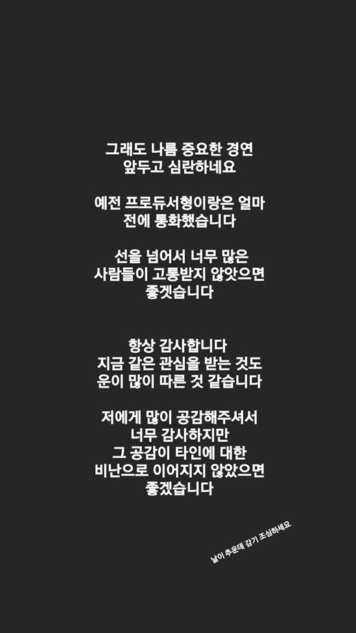 릴보이는 17일 인스타그램을 통해 "그래도 나름 중요한 경연 앞두고 심란하네요"라며 "예전 프로듀서 형이랑은 얼마 전에 통화했습니다"라고 밝혔다. 그러면서 릴보이는 "선을 넘어서 너무 많은 사람들이 고통 받지 않았으면 좋겠습니다"라고 했다. 팬들에게도 "항상 감사합니다. 지금 같은 관심을 받는 것도 운이 많이 따른 것 같습니다"라면서도 릴보이는 "저에게 많이 공감해주셔서 너무 감사하지만 그 공감이 타인에 대한 비난으로 이어지지 않았으면 좋겠습니다"라고 당부했다.