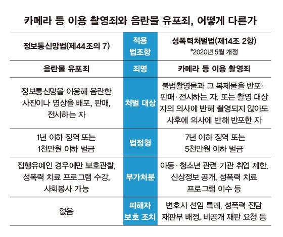 이와 달리 정보통신망법 음란물 유포죄의 법정형은 1년 이하 징역 또는 1천만원 이하 벌금으로 낮다. 정보통신망법은 영상 속 인물이 아닌, 사회의 건전한 성풍속을 보호하는 게 목적이기 때문이다. 특정한 개인의 법익 침해를 처벌하는 성폭력처벌법과는 그 죄질이 다르다. 성폭력 범죄가 아니기 때문에 취업 제한, 신상정보 공개 등 성범죄자에게 따라붙는 부가처분도 할 수 없다. 그러나 디지털성범죄가 성폭력처벌법의 그물망을 통과해 정보통신망법으로 처벌되는 사례가 관행처럼 존재한다.