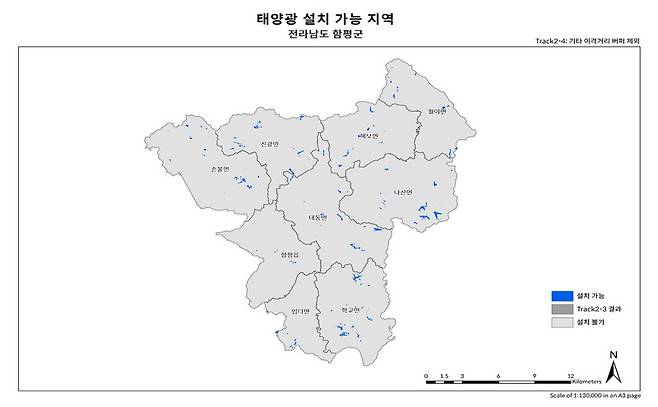 기후운동단체 ‘기후솔루션’은 경북 구미시, 전남 함평군, 경남 함양군이 시행 중인 태양광 발전 입지규제(10월 기준)를 지리정보체계(GIS)를 이용해 분석했다. 규제를 피해 태양광 발전시설을 설치할 수 있는 면적은 경북 구미시 0.09%, 전남 함평군 0.78%, 경남 함양군 0.64%만 남는 것으로 나타났다. 이들 지역에선 사실상 태양광 발전시설을 새로 설치하는 것이 불가능하다. 이는 농지법 등 상위법 규제로 제외되는 면적과 경제성이 없어 사실상 태양광 사업이 어려운 임야까지 제외한 것으로, 입지규제만으로 제외되는 면적이 해당 기초자치단체 면적의 46~67%에 이르렀다.