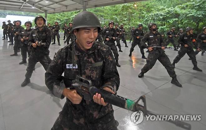 (창원=연합뉴스) 해군 668기 훈련병이 12일 경남 창원시 진해구 해군교육사령부 야전교육대대에서 각개전투 포복술 응용 훈련을 하고 있다. 2020.8.12 [해군 제공. 재판매 및 DB 금지]