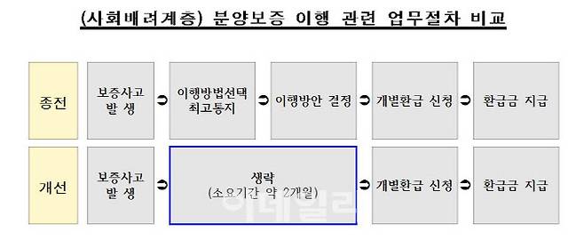 일반적인 경우 보증사고 발생 후 환급이행 완료까지 통상 약 3개월이 소요된다. 이행방법 결정까지 2개월, 이행방법 결정 후 환급이행심사 및 완료까지 1개월이다. 하지만 이번 HUG 조치에 따라 사회배려계층의 경우 환급에 소요되는 기간이 약 2개월 단축돼 금융비용 부담이 크게 줄어들게 될 것으로 기대된다.