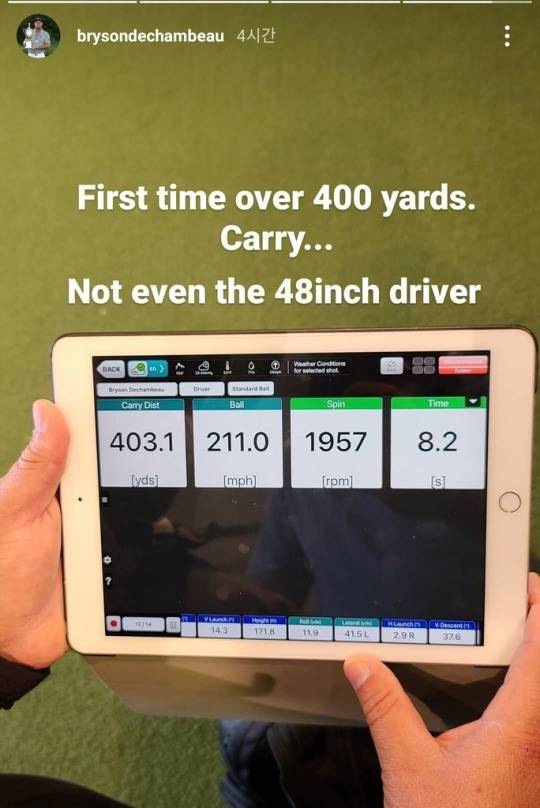 디섐보는 24일(한국시간) 자신의 소셜 미디어에 "처음 400야드를 넘겼다. 48인치 드라이버를 쓴 것도 아니다"라는 글을 올렸다.