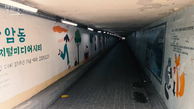 상암동 디지털미디어시티와 수색동을 오가는 지름길인 이 지하통로는 두 지역의 절묘한 대조를 극명하게 보여주고 있는데요. 상암동 쪽에서 길이 188m의 지하통로를 걸어 나가면 재개발 지역의 원주민들의 애환과 희망이 그대로 투영된 듯한 느낌마저 들게 합니다.