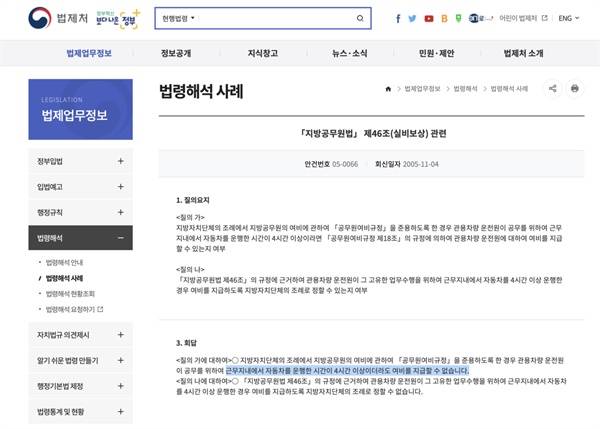 하지만 법제처 해석은 은평구청과는 달랐다. 법제처에서는 '관용차량 운전원이 공무를 위하여 근무지 내 자동차를 운행한 시간이 4시간 이상이더라도 여비를 지급할 수 없으며 이를 지급하기 위한 조례도 제정할 수 없다'고 규정하고 있다.