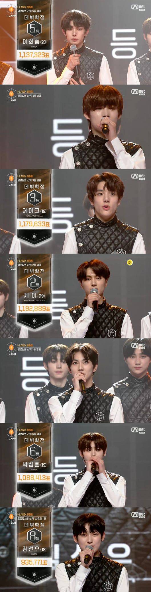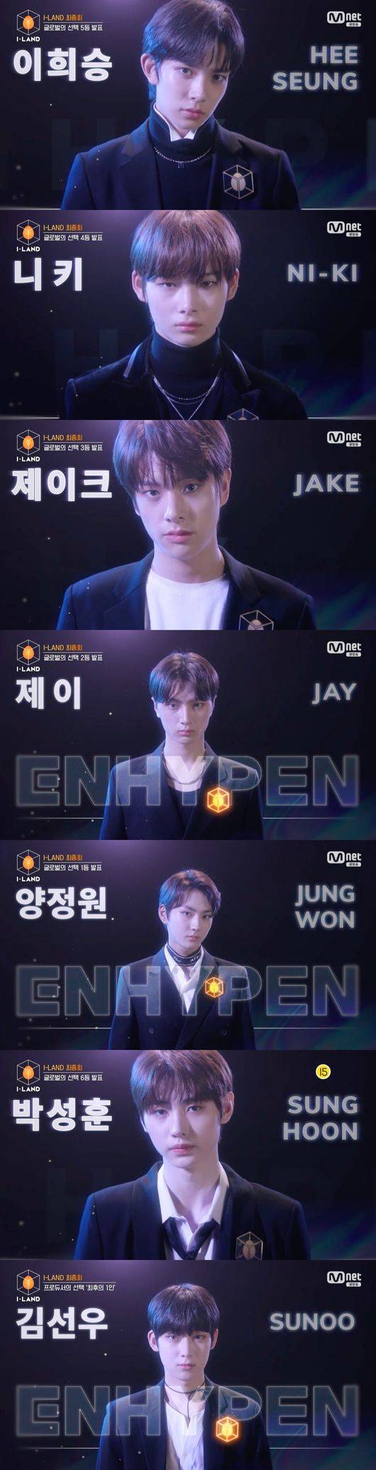 지난 18일 오후 방송된 Mnet 'I-LAND(이하 '아이랜드')' 마지막회에서는 '엔하이픈(ENHYPEN)' 데뷔 멤버로 호명되는 이희승, 니키, 제이크, 제이, 양정원, 박성훈, 김선우의 모습이 그려졌다.
